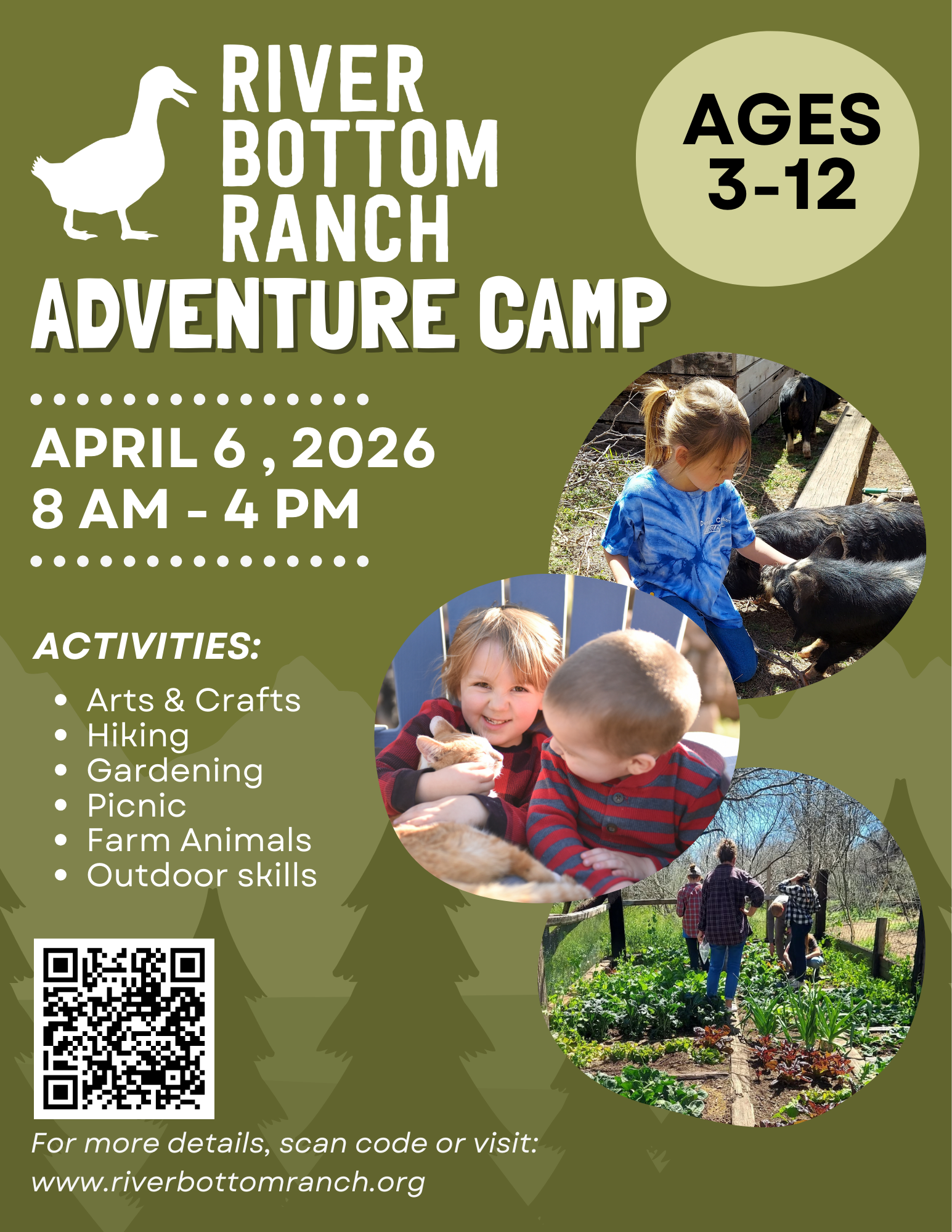 Our program will teach gardening skills, how to interact with and care for farm animals, and engage in outdoor crafts and activities. Designed for kids ages 3-12, the camp runs from 8 AM to 4 PM and is entirely outdoors, so please dress accordingly. We'll provide snacks and lunch to keep our little adventurers energized throughout the day. The cost for this fantastic experience is $75 per child, $25 sibling discount. Don't miss out on this great opportunity for your children to learn and have fun outdoors!